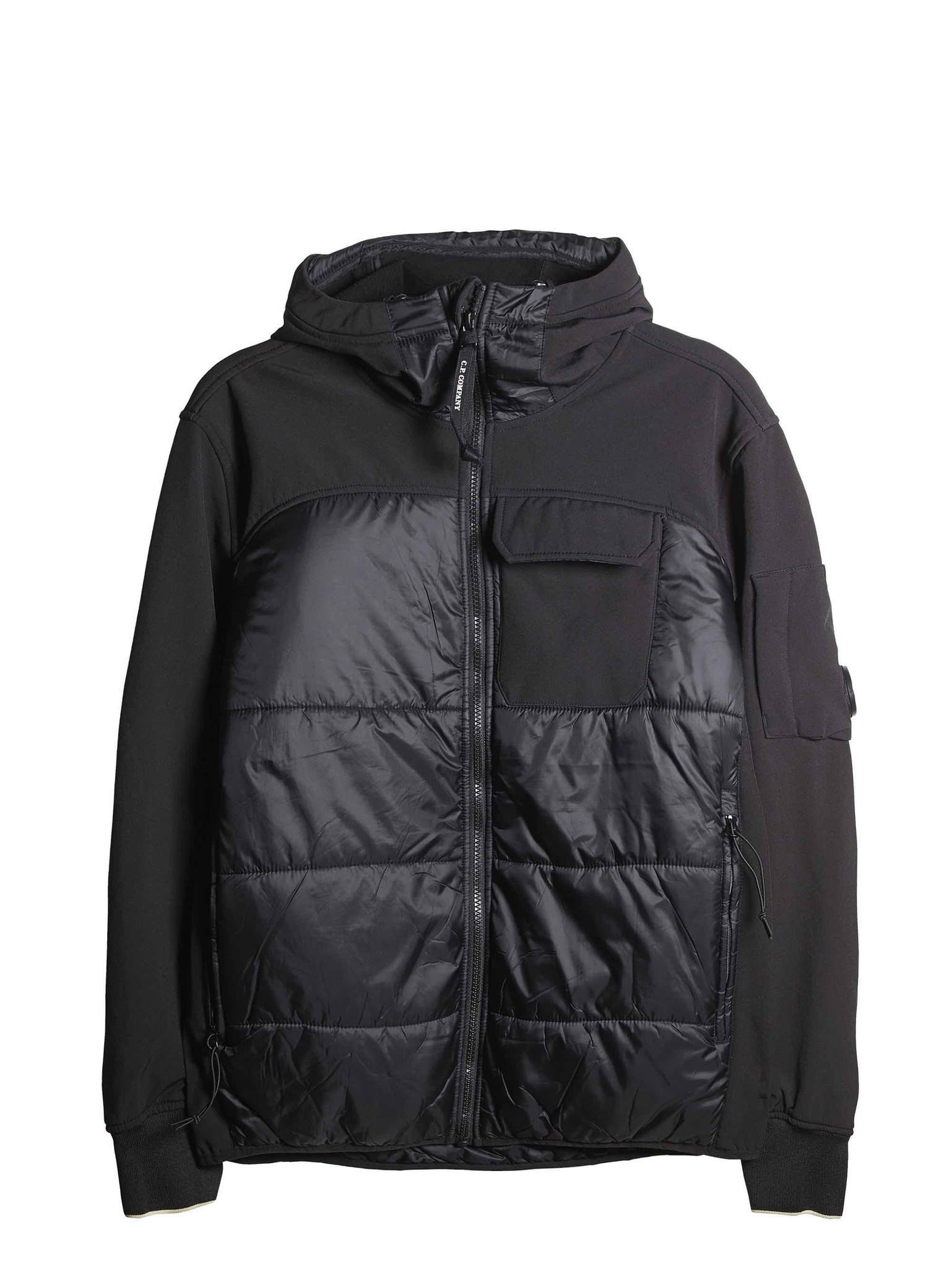SOFT SHELL HOODED JACKET WITH ARM LENS IN BLACK